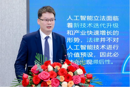 上海汉盛律师事务所高级合伙人李旻律师则围绕“未来产业布局中的地方立法赋能与实践”进行了精彩分享。李旻律师首先指出了我国人工智能立法面临的两大困境,即技术与法律的“时差困境”以及监管陷入“科林格里奇困境”;随后通过借鉴国际立法经验,对比美国与欧盟在人工智能立法层面的时间,分析出不同的策略与需求;进而对于我国人工智能立法定位与具体路径提出个人见解,他指出,地方立法在人工智能立法中可作为“总则式”立法的补充与先行,并举出多个人工智能地方立法实例论证。此外,他提出,随着人工智能产业的成熟以及地方立法的不断完善,地方在面对人工智能等新技术立法时,应逐渐从被动管控风险转向鼓励协同监管的模式革新,在中国语境下,通过对不同应用场景建立规则的方式牵引产业聚集,不仅有效克服法律的不确定性,也可以引导资本、人才、技术等要素向目标领域汇聚,更好发展人工智能。