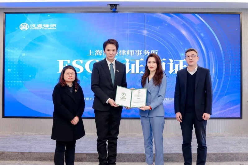 上海汉盛律师事务所通过通用ESG标准认证与公示机构——UESG优世界(中国)的严格评估。在陆家嘴管理局经济发展处处长吴剑峰女士、上海市知识产权局法制处副处长宋嘉等领导共同见证下,UESG优世界(中国)董事总裁曲庭贤亲自登台,为汉盛颁发了ESG认证证书。