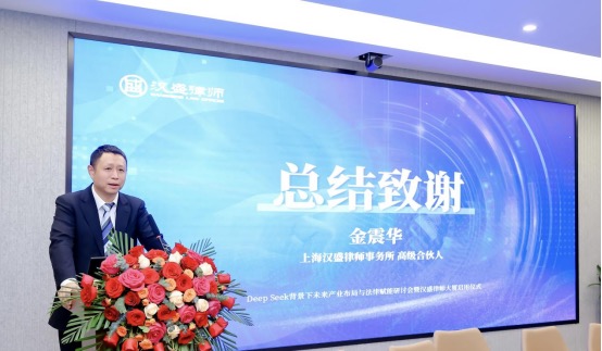 上海汉盛律师事务所党委书记、高级合伙人金震华作研讨会总结,并代表主办方对所有嘉宾的出席和精彩发言表示感谢!他表示,作为法律界对Deep Seek与未来产业这两个相互联系议题的首次探讨,本次研讨会涵盖未来产业在地缘政治背景下的立法、执法、法律合规与中国企业海外布局的法律瓶颈以及突破路径,旨在为与会嘉宾、法律界同仁提供一个交流和学习的平台,为推动行业创新和发展注入了新的动力,也为推动上海未来产业布局与法律赋能的发展贡献了智慧和力量,意义深远。