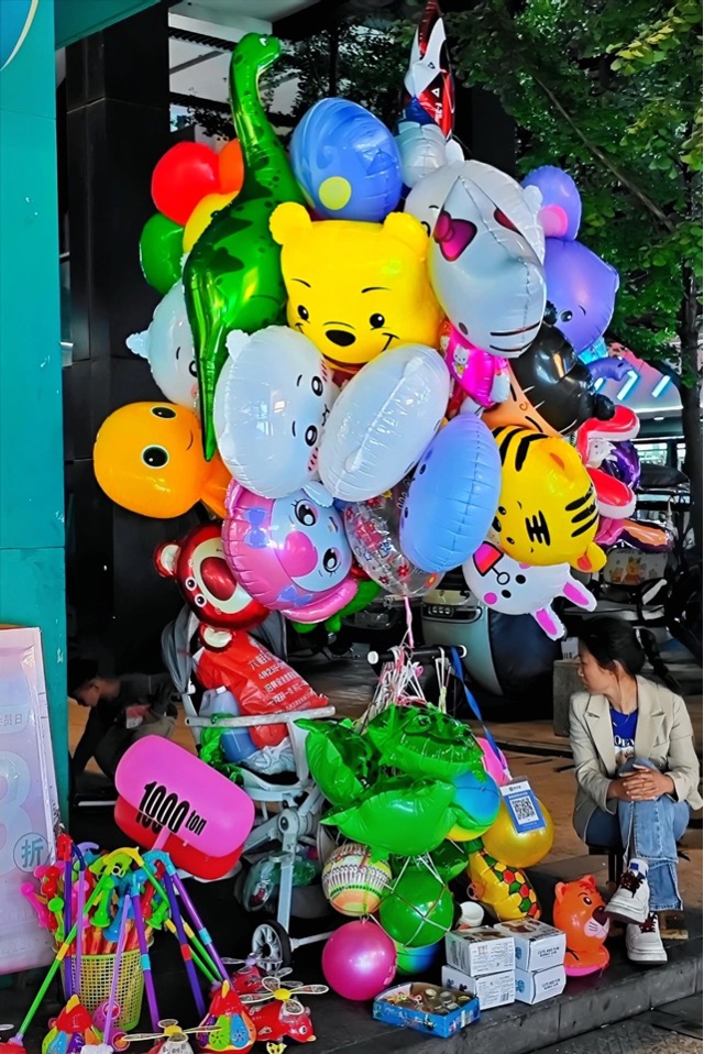 作品介绍:一位穿着朴素、面带和蔼笑容的中年阿姨,守着摆满五颜六色气球的地摊,不知道今夜这些彩色气球将会装点哪些小朋友的梦?