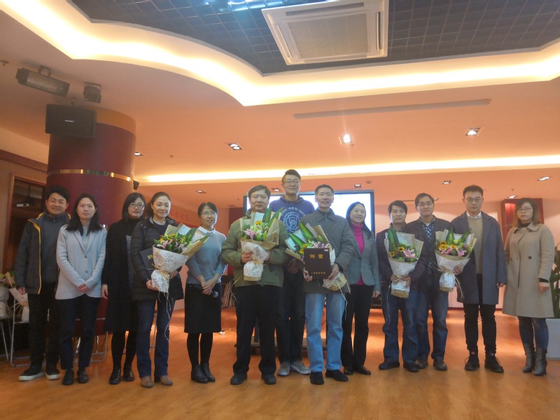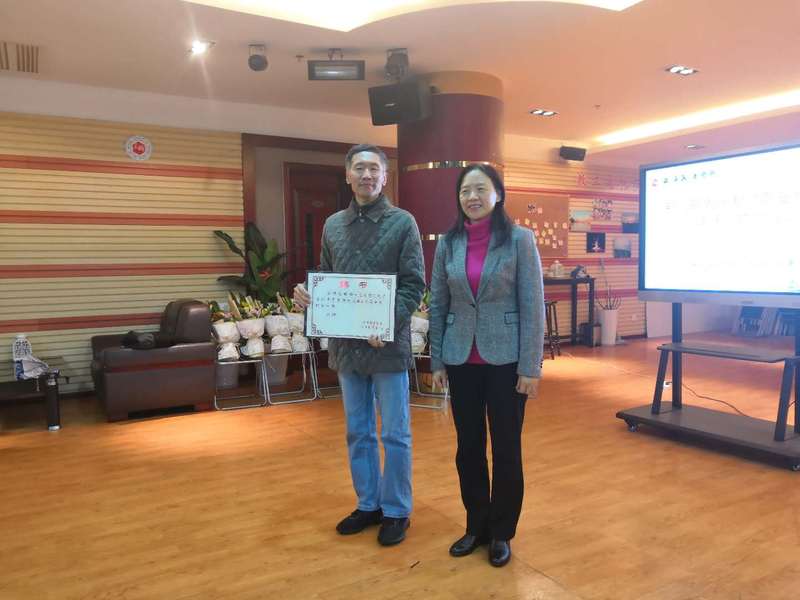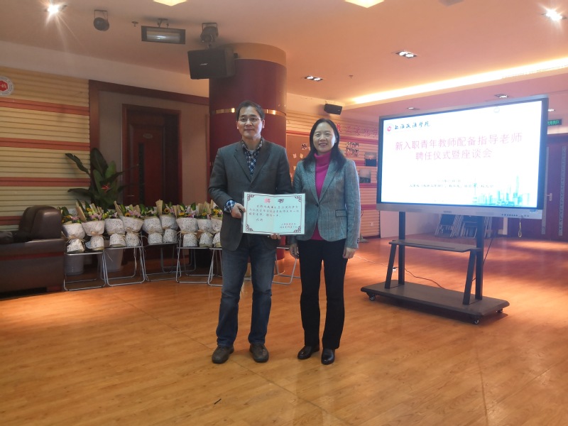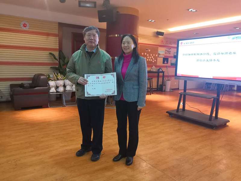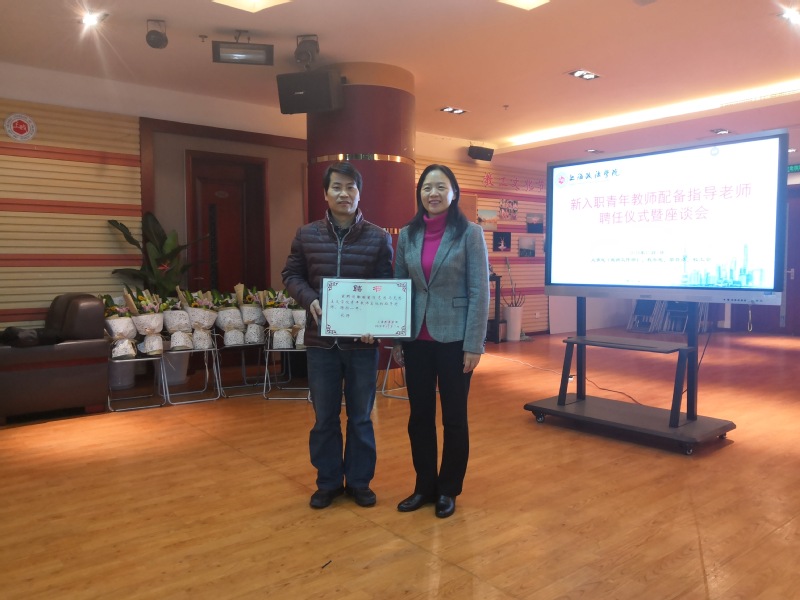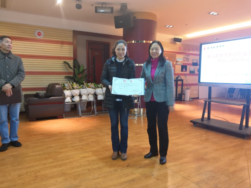 聘任仪式上,副校长胡继灵依次为指导教师颁发聘书,青年教师为指导老师献上鲜花。