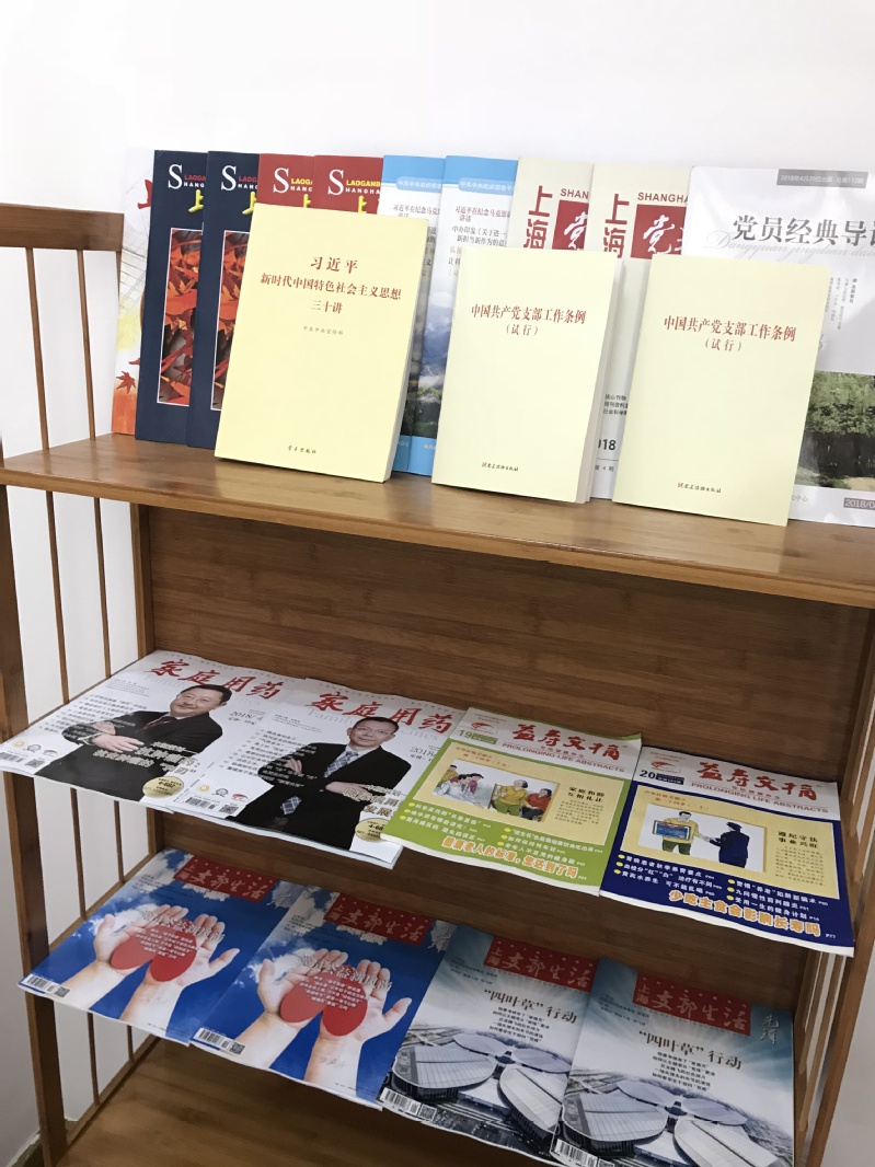 目前活动室共分为三个功能区,集党建、合唱、图书阅览等功能于一体。党建专区配备会议桌椅,内设宣传板块,墙上挂有党支部工作挂图,张彩英老师《平语近人》系列书画作品;图书阅览专区添置了最新的《党章》、《习近平新时代中国特色社会主义思想三十讲》等党建理论书籍,《党员经典导读》、《上海党史与党建》、《支部生活》等党报党刊。