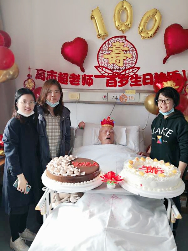离退办工作人员早早来到高老所在病房,和家属、医护人员一起装扮病房。韩惠芝代表学校向高老送上鲜花、蛋糕和慰问金,祝愿老人家健康长寿。李书娟向高老的家人详细了解了他的健康状况和生活情况,并对医院的医护人员表示慰问,感谢她们的悉心治疗和精心护理。高老的家人对学校一直以来关心、爱护离退休老同志的举措表示衷心感谢。