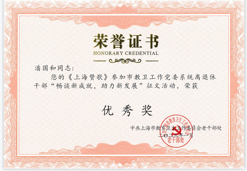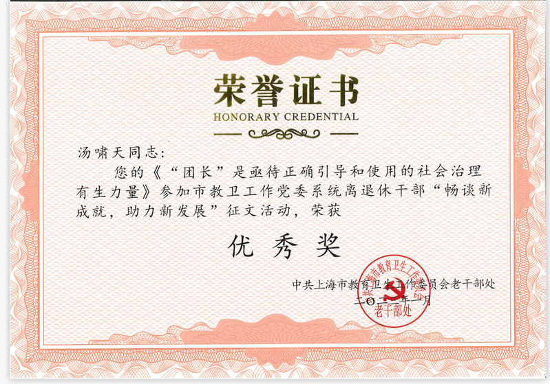 近日,从上海市教卫工作党委传来喜讯,我校退休教师潘国和的《上海赞歌》、汤啸天的《“团长”是亟待正确引导和使用的社会治理有生力量》在市教卫工作党委系统离退休干部“畅谈新成就,助力新发展”征文活动中,均荣获“优秀奖”。汤啸天教授的《关于将申办自闭症学校作为非共识创新项目予以支持的建议》《实现思想政治教育从知识传授向观念行程的转变》参加市教卫工作党委系统离退休干部“我为‘十四五’开好局献一策”活动,分别获得“铜点子”奖和“银点子”奖。离退休工作办公室2023年3月31日