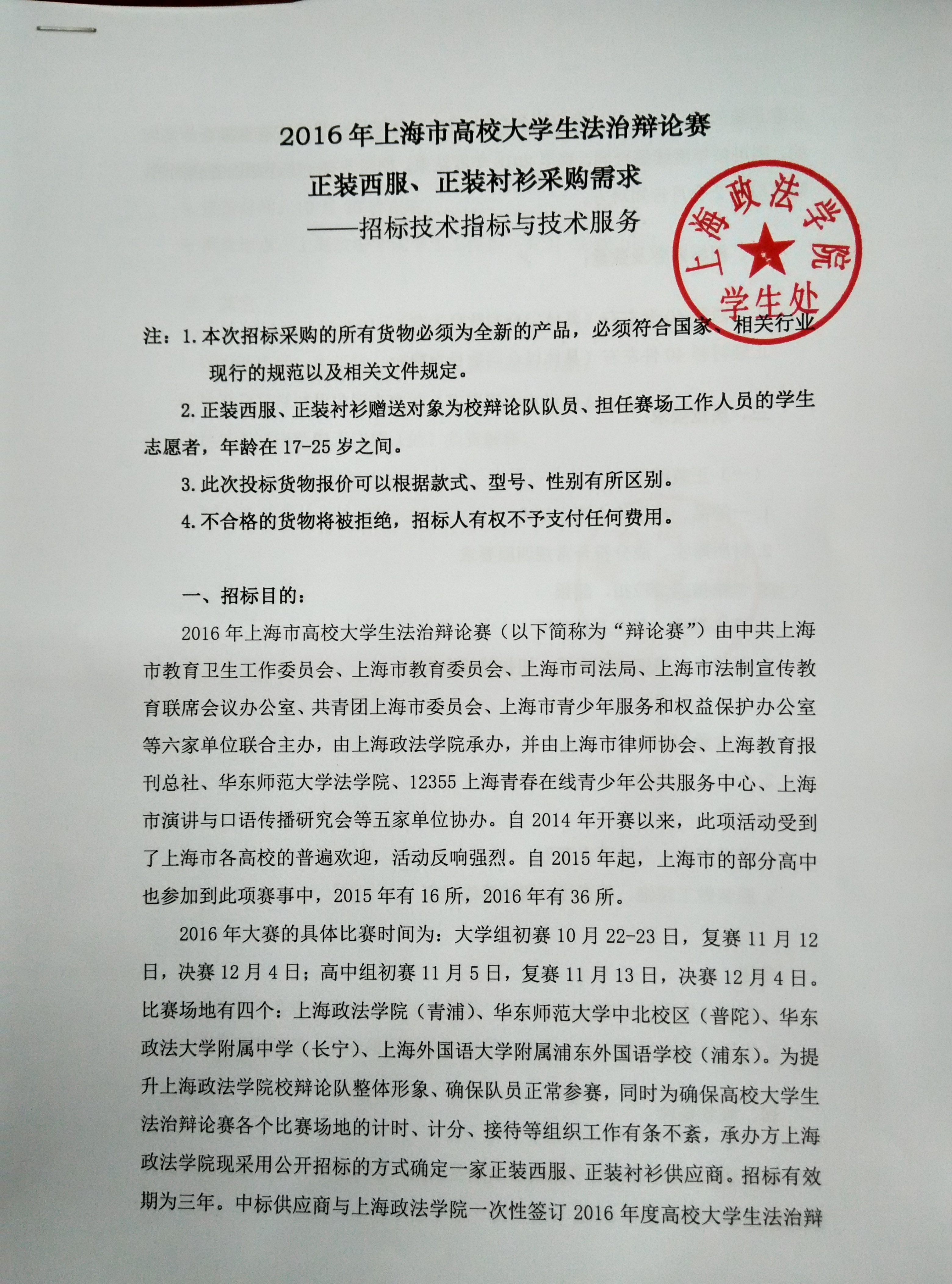 项目名称:2016年上海市大学生法制辩论正装西装、正装衬衫采购