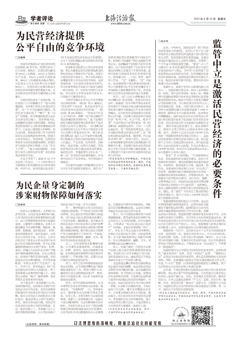 近年来,个别监管机构对包括民企在内的市场主体采用高额罚款、停止营业等严厉的监管措施,已对民营企业等市场主体的信心造成严重打击。因此,为发展壮大民营经济,激发市场活力,当务之急就是要摒弃“严父式”监管,改采告知、提醒、劝导、首违不罚等“慈母式”监管方式。以监管中立为原则,为包括民营企业在内的市场主体创造稳定可预期、统一公平、简约公开且宽松的监管氛围。(原文刊载于《上海法治报》2023年8月18日B7版“学者评论”)