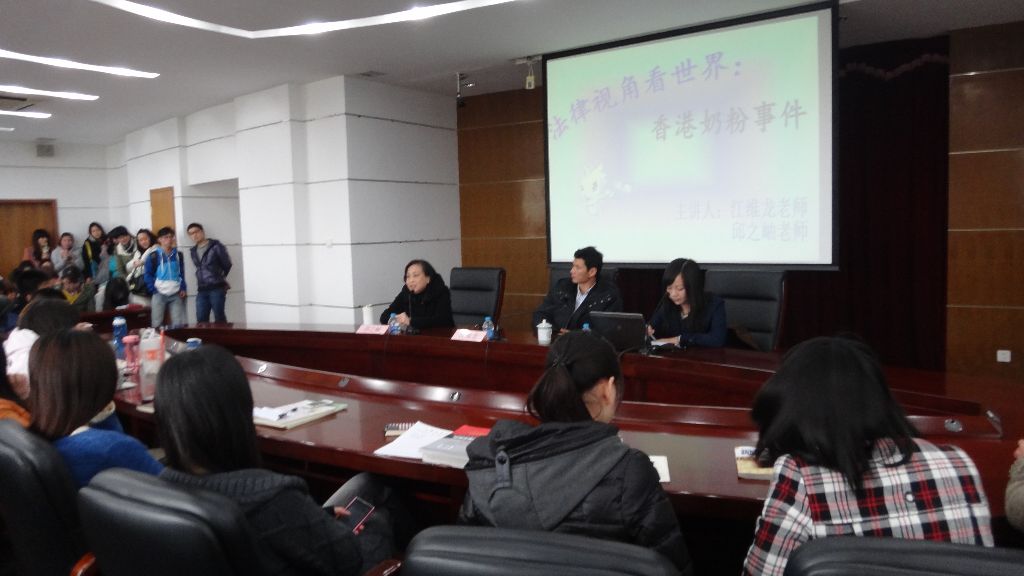 2013年3月26日下午,法律学院团学在视频会议室召开法廌系列讲座——法律视角看世界之香港奶粉事件,在行政楼视频会议室顺利开展。法律学院邱之岫老师以及刑事司法学院江维龙老师为此次讲座的主讲老师。
