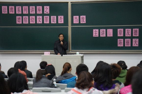 接着,章友德老师由女性地位及性的解放之路延伸出对于嫖宿幼女罪是否属于科学立法的问题,并在讲座中强调呼吁同学们应思考现有法律条文是否具有科学性,对现有法律进行二次的批判审视,以及立法应立良法。陈丽天老师亮出了与章友德老师截然相反的观点——嫖宿幼女罪本身无错,只是因为涉案人员多为公职人员及企业家,才引发官民对立,继而导致该罪成为对立交锋点。