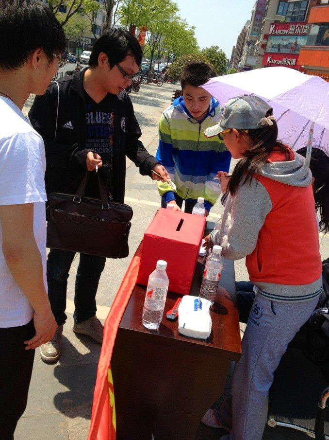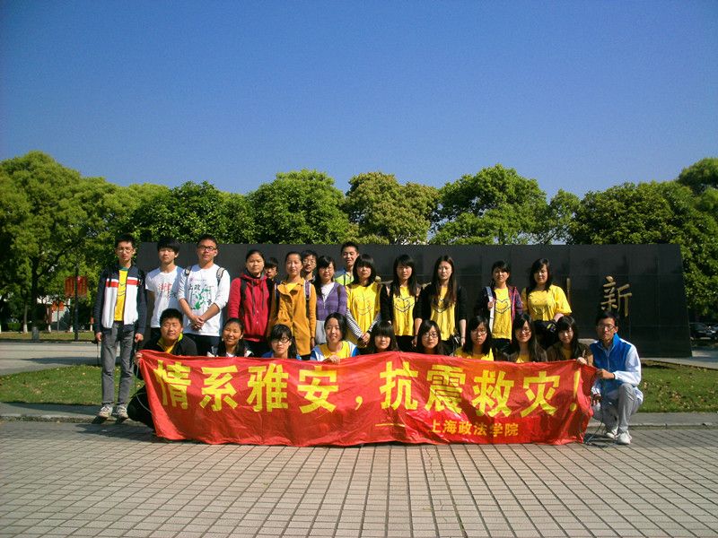 2013年4月20日08时02分四川省雅安市发生7.0级地震,我校法律学院李德锐同学的家正好位于重灾区的宝兴县灵关镇,该同学家的房屋已全部坍塌,其父母均为农民,现居住于政府临时搭建的帐篷内。为了帮助该同学,让其不会因为生活上的问题困扰学习,法律学院团学自发组织26名同学,分成四组,于4月26日,在陈坊桥、佘山地铁站两地分别进行募捐活动。