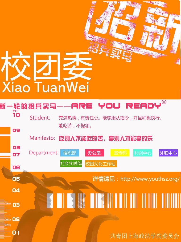 团委宣传部下设四个中心,分别为:文字中心、网络宣传中心、宣传制作中心及“上政青年”团报编辑部。本次招新主要面向“上政青年”团报记者团招新。“上政青年”团报编辑部主要负责团报的编辑、排版等工作。现为服务于团报,特成立“上政青年记者团”,其主要职能为服务于每期团报,以每期团报主题撰写稿件,拍摄照片等工作。