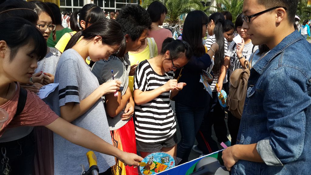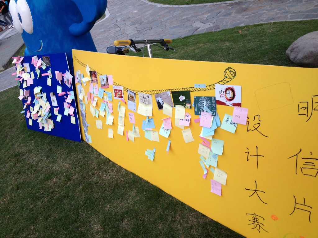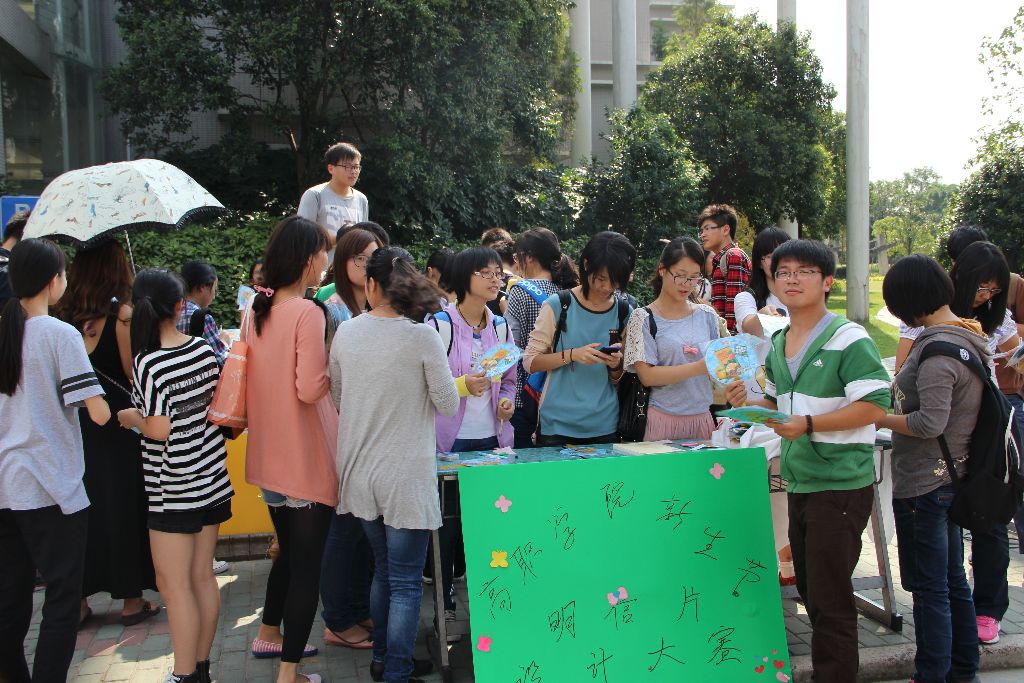 2013年10月14日中午12点,高职学院的学生们在世博广场向全校同学展示了“首届新生节﹒明信片设计大赛”的优秀作品。