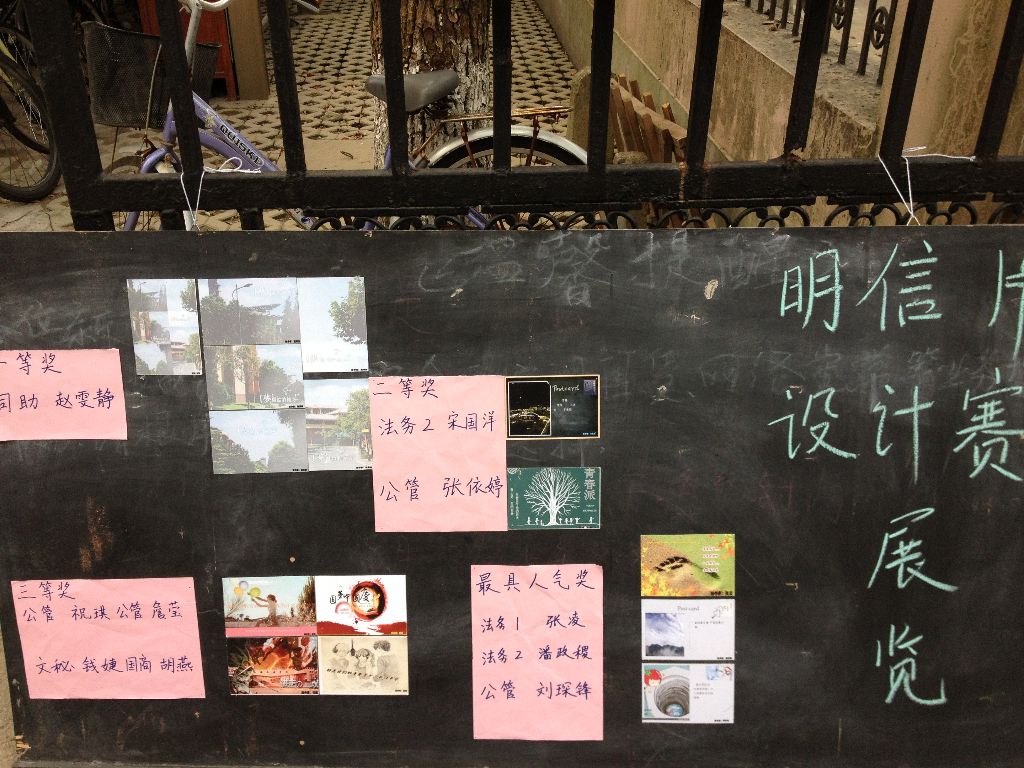 在展示现场,学生会的干事们顶着正午的烈阳,积极热情地向同学们宣传着参加此次设计大赛的明信片。参赛者们更是意气风发,向着前来投票的同学宣传自己的设计理念,希望获得宝贵的一票。一波波的同学们走向活动场地,也让我们的宣传者更加充满激情。一个中午的时间,展板上便贴满了用来投票的小纸片。然而,随着上课时间的接近,来往的同学们渐渐变少,但是,我们宣传者的热情没有褪去。在下午5点,学院组织了第二次宣传。趁着大好的夕阳,残阳照射在明信片上,更是别有一番韵味。直至夜幕降临,人群才逐渐散去,也为本次活动画下了一个圆满的句号。最终,清点票数后,我们评选出了三位最具人气奖,他们分别是来自法务一班的张凌,法务二班的潘政稷和公管一班的刘琛锋。