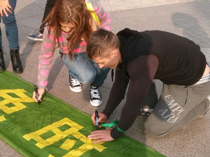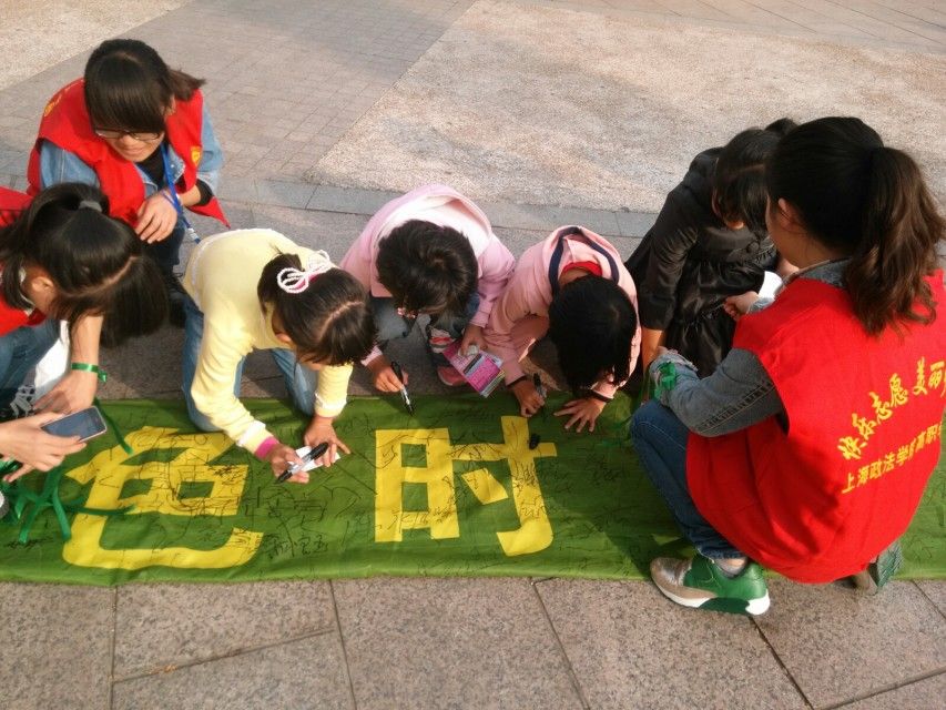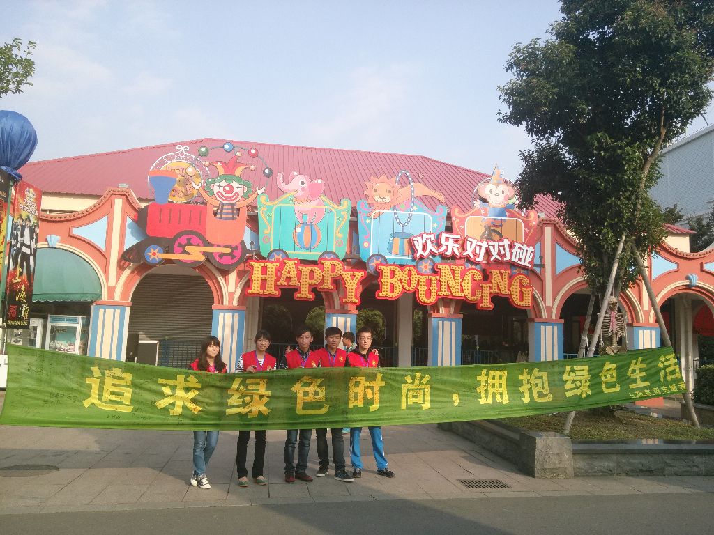 欢乐谷是上海乃至全国规模最大、景色最美、科技含量最高的主题公园,客流量大。活动一开始,我们就吸引了大量的游客前来 签名。尤其是青少年,他们看到绿色环保横幅都十分感兴趣,争先恐后前来签名,还帮着志愿者做宣传。挤在人群中的还有一些刚学会写字的小朋友,他们也在横幅上签上了名字。在游客签名的时候,志愿者为他们系上绿丝带,动员大家为保护环境献出自己的力量,从小事做起,如节约用电、垃圾分类等。我们的活动还吸引了 不少来自外国的游客。