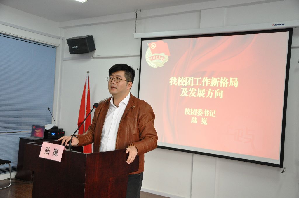 仪式结束后,校团委书记陆嵬老师为学员们带来了专题报告第一讲《我校团工作新格局及发展方向》。在报告中他指出了团干部的引领作用,同时通过具体案例阐述校园活动该如何推广,并强调了宣传舆情建设的重要性。