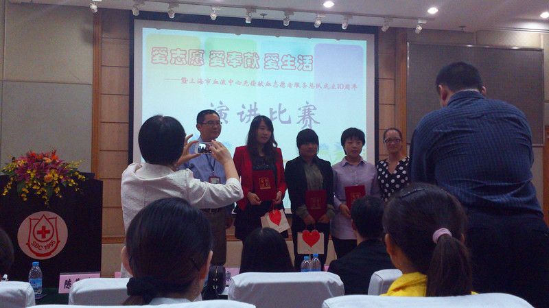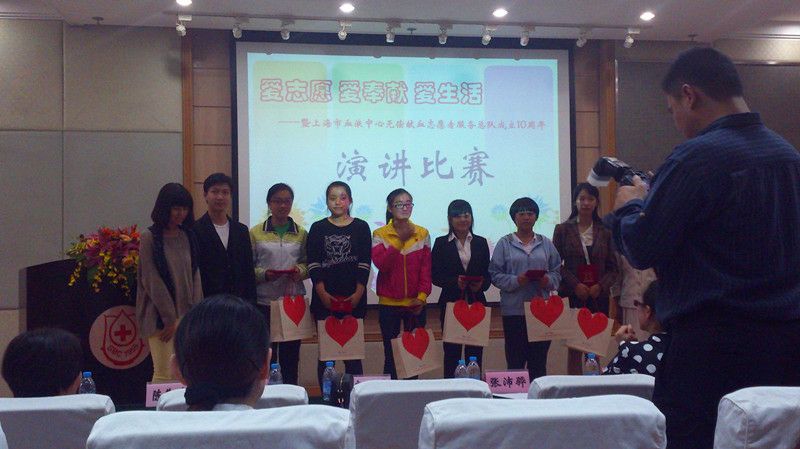2013年11月3日,血液中心服务队队长马小龙带领志愿者侯新怡、张凌、孙逸涵、黎姗、陈瑞、薛文龙、崔翔、陆秋任、岑明丹、马彪等来到上海市血液中心,参加上海市血液中心志愿者服务总队举办的主题为“爱志愿、爱奉献、爱生活”演讲比赛。