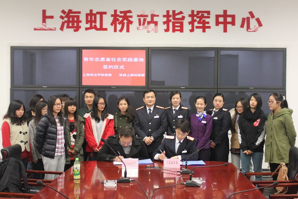 11 月 26日下午 ,铁路上海站团委与我校团委青年志愿者社会实践基地签约仪式在铁路上海虹桥站举行。铁路上海站副站长吴振荣同志、铁路上海站团委书记陈浩同志、校团委副书记蒋存耀老师及我校青年志愿者出席了本次活动。