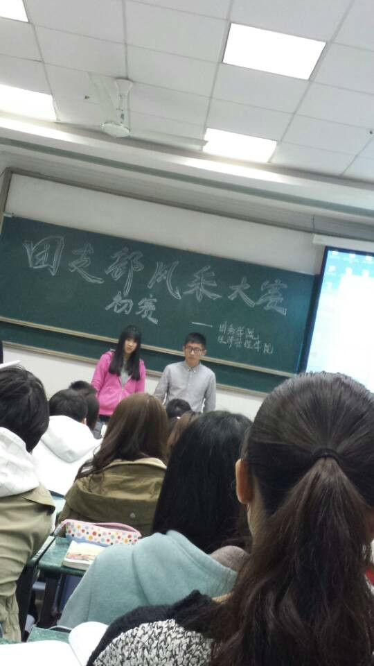 2013年11月18日下午6时整,国务与经管两兄弟学院于信教109隆重召开团支部风采大赛初赛,本次活动各院系团总支皆积极响应,有20个团支部参加了此次初赛,初赛评委由校团委组织部部长赵向楠、国务学院团总支副书记张清风、校园文化部部长严廷禹、组织部部长白娜、组织部副部王朝南,经管学院团总支副书记陈斯奇、团副助理谭佳斌、组织部部长施佳玲、组织部干事刘一鸣、陈斌斌担任。