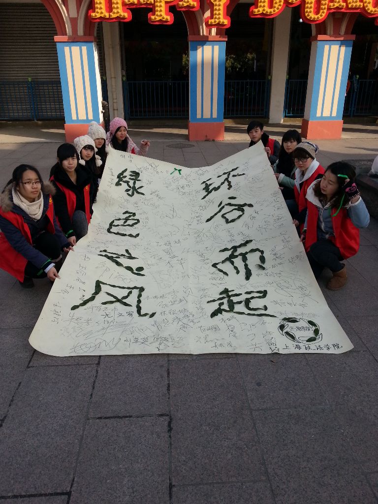 本次活动的宣传形式多种多样。同学们为游客绑上象征绿色生活的绿丝带,请游客写下环保寄语,为游客发放环保小贴士,带动游客将树叶贴在准备好的幕布上拼出“绿色之风,环谷而行”的字样等。上午的游客以老年人为主,在同学们的热情带动下,他们乐呵呵地粘贴树叶,写环保寄语,并仔细阅读环保小贴士上的生活中的环保方法如垃圾分类等,还不断夸奖我们。中午过后,欢乐谷的客流量增大,越来越多的游客被我们的活动吸引。活动的最后,同学们在树叶拼成的字样旁边签下自己的名字,承诺自己将带动周围的人从小事做起,坚持环保理念。