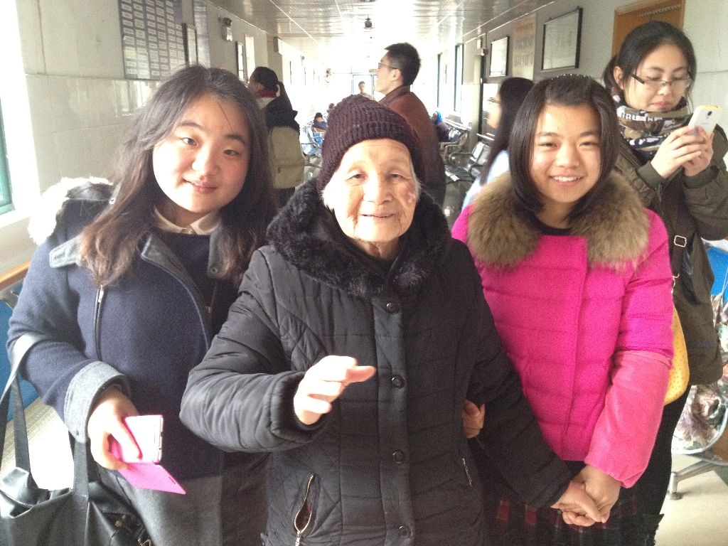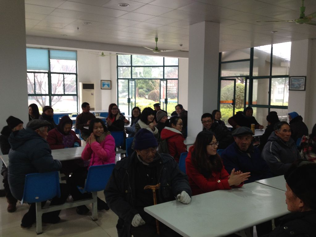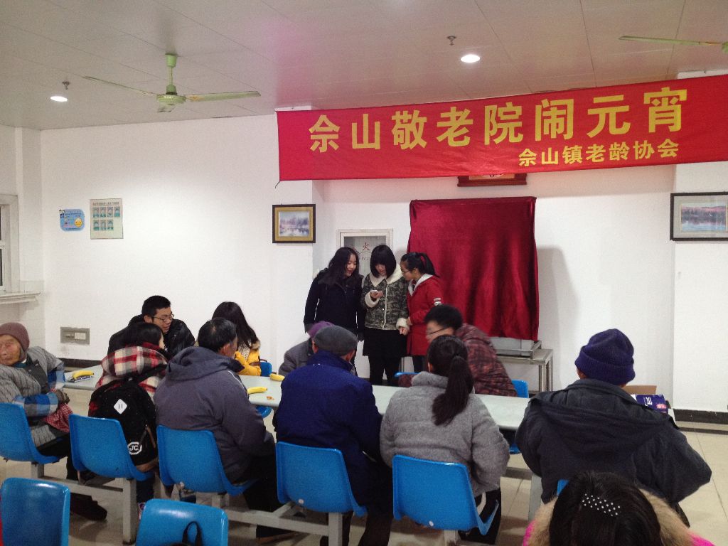 开学例行的首日教育结束后,下午12点半左右,志愿者们携带着水果、牛奶、麦片等慰问品来到了佘山敬老院。据悉,佘山敬老院居住着200多位老人,多为上海本地人,老人们有的是因为年纪较大,常年独居却没人照顾,被统一安排到这里,有的是家中子女无暇照顾来到这里。在和老人们愉快的交谈过程中,志愿者们认真倾听老人已不太清晰的话语,还主动为老人们表演起了节目,从电视剧《三国演义》的主题曲到小虎队的《爱》,悠扬的歌声给老人们带来欢乐,欢声笑语洋溢在偌大的餐厅中。一位86岁高龄的老奶奶给志愿者们讲起了她年轻时的故事,回忆旧上海的风云,年轻的志愿者们虽不能完全听懂上海话,但还是被老人的故事所吸引;临别时,老人还不停地感叹,“你们这些孩子生在了一个好时代啊,我们那时候苦啊,有了共产党,现在的生活越来越好了”,脸上洋溢着幸福的笑容。
