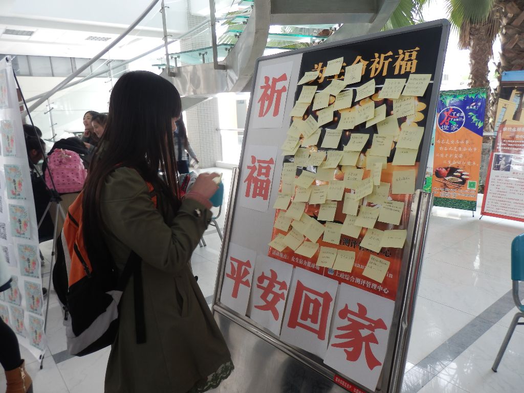 马航飞机的事故自从发生以来便紧紧牵动着每个人的内心。而到现在依然没有飞机的相关消息,我们只能为之祈福,把对马航飞机的关注持续下去。同时也希望能够尽快破解谜题,让真相水落石出。而同学们对他们的祈福也将通过这次的活动传递到远方。(冯斯琳撰稿、摄影)