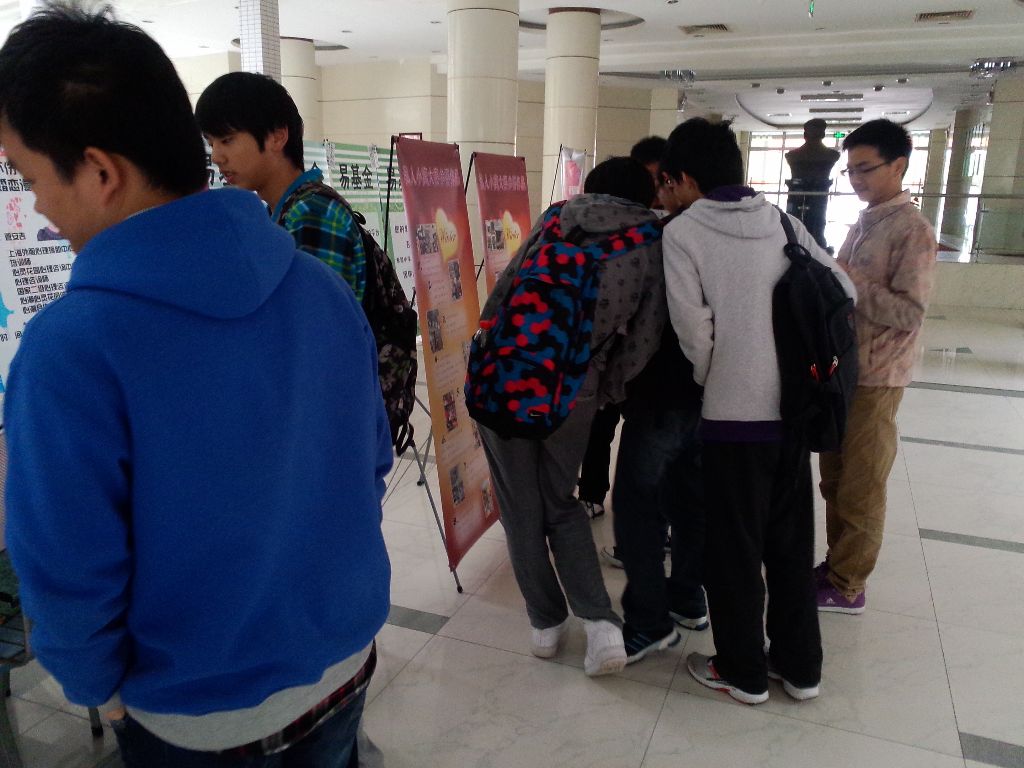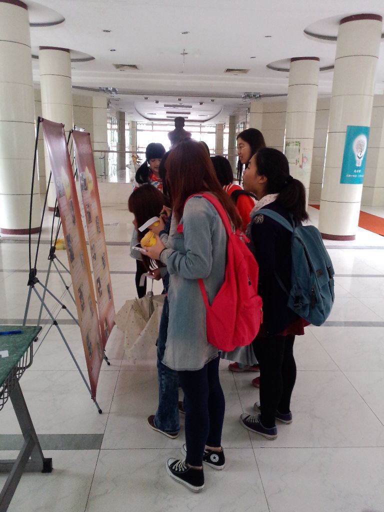 尽管阴雨绵绵,但恶劣的天气却依旧阻挡不了同学们的热情,纷纷前来投票。信教底楼,人潮涌动,同学们一个个都驻足在作品展架前,仔细欣赏着16幅参赛作品,并认真挑选自己心仪的设计,其中两位热心的保洁阿姨也积极参与,更有几名参赛者进行现场拉票,使活动现场气氛达到高潮。