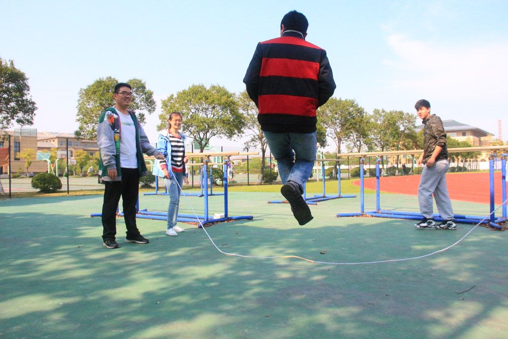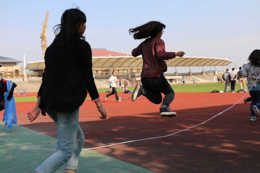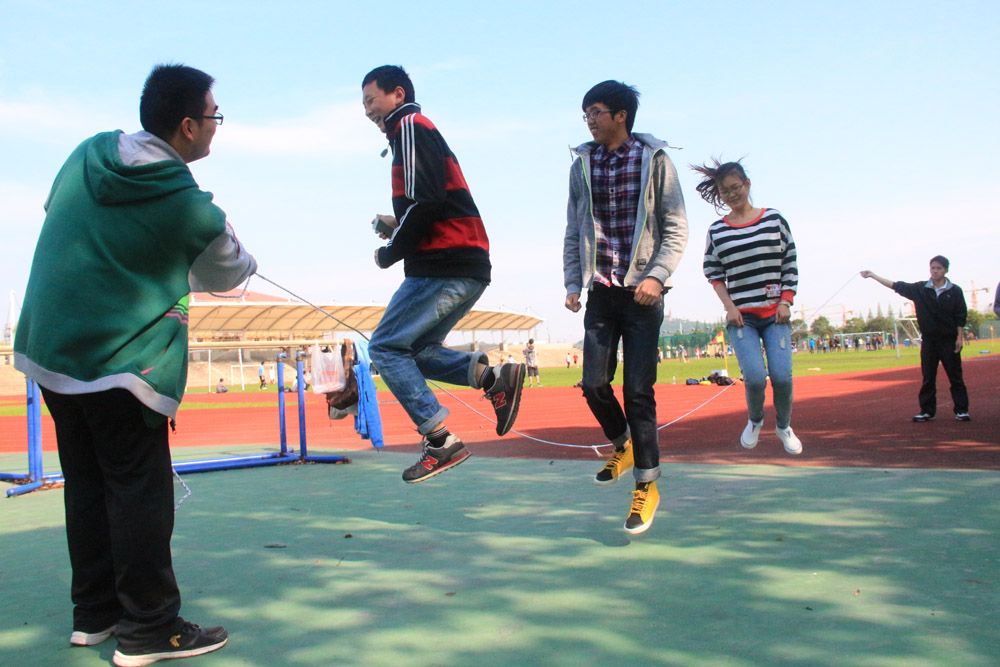 2014年4月22日下午3点整,为响应校团委“走下网络、走出寝室、走向操场”活动,我院各团支部自行组合的几支代表队于操场进行了跳长绳活动。本次活动为集体项目,不限男女,每个团支部派出10名学生参加,其中2人摇绳,比赛限时1分钟,以跳过次数最多者为胜。