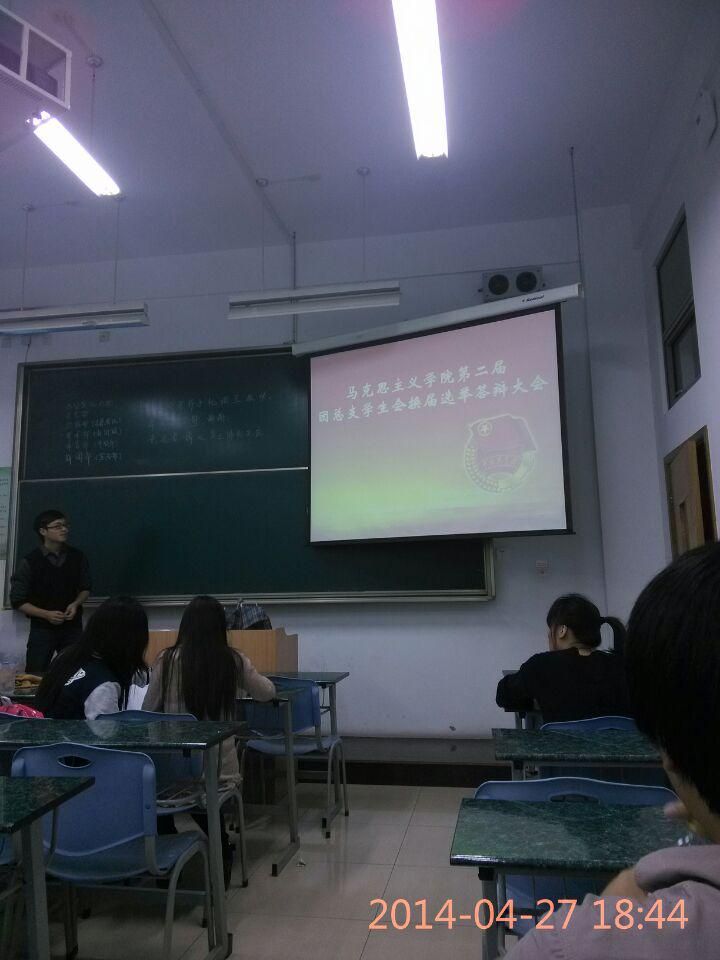又值团总支学生会换届之际,在2014年4月27这天,我院学生在主教学楼206A召开第二届团总支学生会换届选举答辩大会,参加的同学们积极参与,充分准备,在答辩过程中沉着冷静,讲述了自己要竞选的是什么职位,为什么竞选这个职位,以及对未来的规划,演讲最后回答主席团的提问,完成答辩。