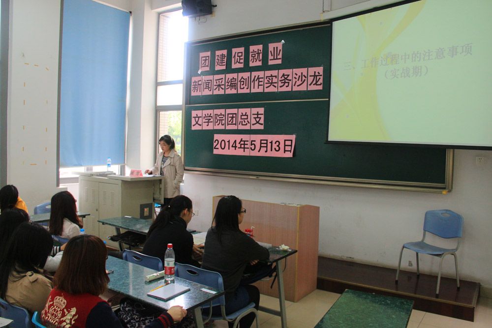 2014年5月13日,为响应校团委“团建促就业”号召,由文学院团总支举办的“团建促就业之新闻采编创作实务”专题沙龙在主教118A顺利举行。本次活动荣幸地邀请到了上海教育报刊总社《东方教育时报·新闻周刊》的记者、编辑臧莺老师为我院新闻学专业的学生进行了新闻实务指导。