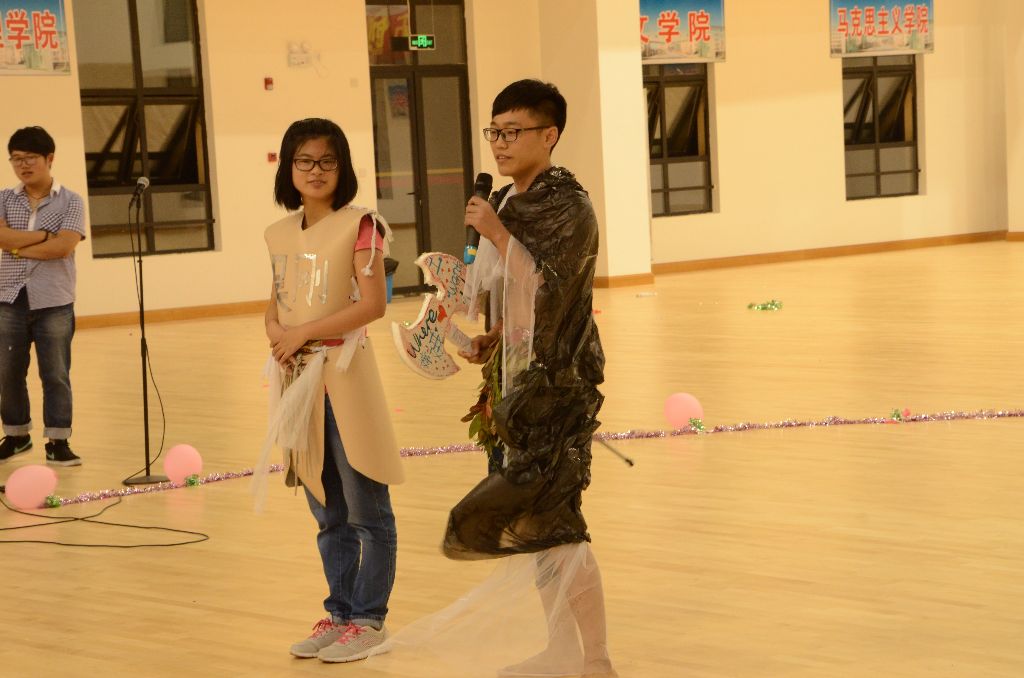 活动伊始,院长姚建龙教授亲自分发月饼给新生,并代表学院为新生送上节日的问候,祝愿新生平安如意,让父母放心,珍惜时光,学有所成。随后的环保服装展示瞬间点燃新生的热情,拉近了新生与导生之间的距离。新生利用环保的材料自制了与中秋人物有关的服饰,并让在场的其他新生猜测所扮演的人物。法学二班新生模仿的后羿,硬纸板制作的斧头活灵活现;法学一班新生模仿的月兔,白色的垃圾袋成为了月兔飘逸的长裙;法学三班的新生模仿嫦娥,诙谐幽默的扮演加上别出心裁的服装赢得了响亮的掌声;监狱二班的两位新生模仿男女两个版本的后羿,豹纹毛毯制作的服饰让男后羿威武十分;监狱一班的新生模仿嫦娥,利用窗帘制作服饰。社矫班的新生模仿月兔,毛绒毯子制成的兔耳朵可爱俏皮。