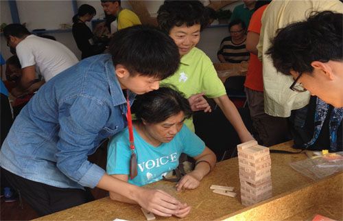 活动中,志愿者们事先准备了各种益智游戏,如搭积木、挑竹签、七巧板、九连环等等。老人们在活动中积极参与,尝试各种各样的益智游戏,对于不能解开的游戏先是坚持一个人独立思考,然后再询问志愿者们。志愿者们也耐心地为老人讲解,直到老人们懂得游戏的诀窍。活动过程中,老人与志愿者们相处十分融洽,活动室中充满着欢声笑语。