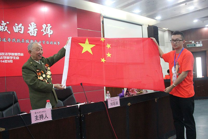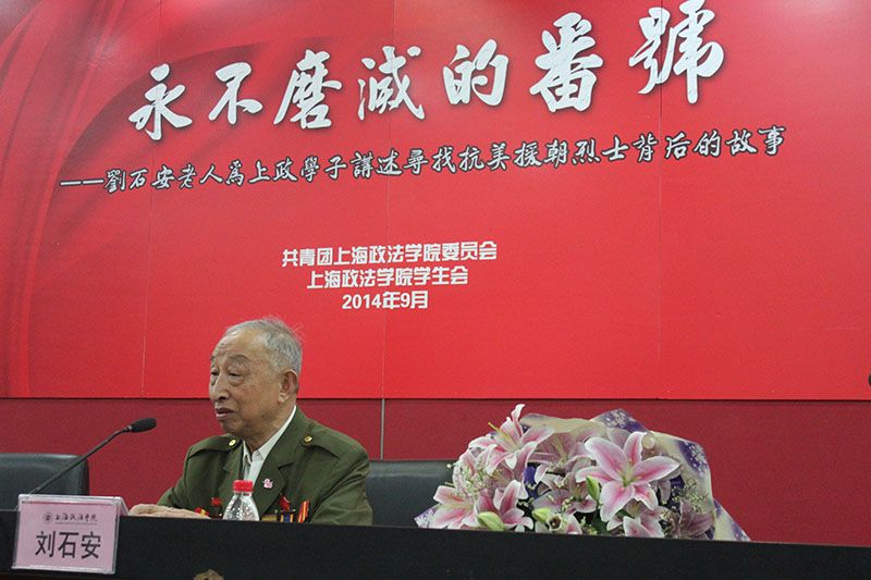 9月29日下午,为迎接首个国家烈士纪念日和第65个国庆节的到来,校团委、校学生会举办了“永不磨灭的番号—刘石安老人为上政学子讲述找寻抗美援朝烈士背后的故事”事迹分享报告会。