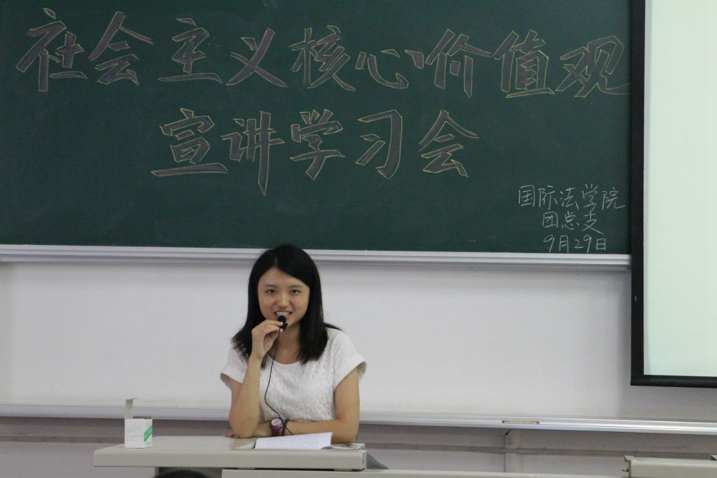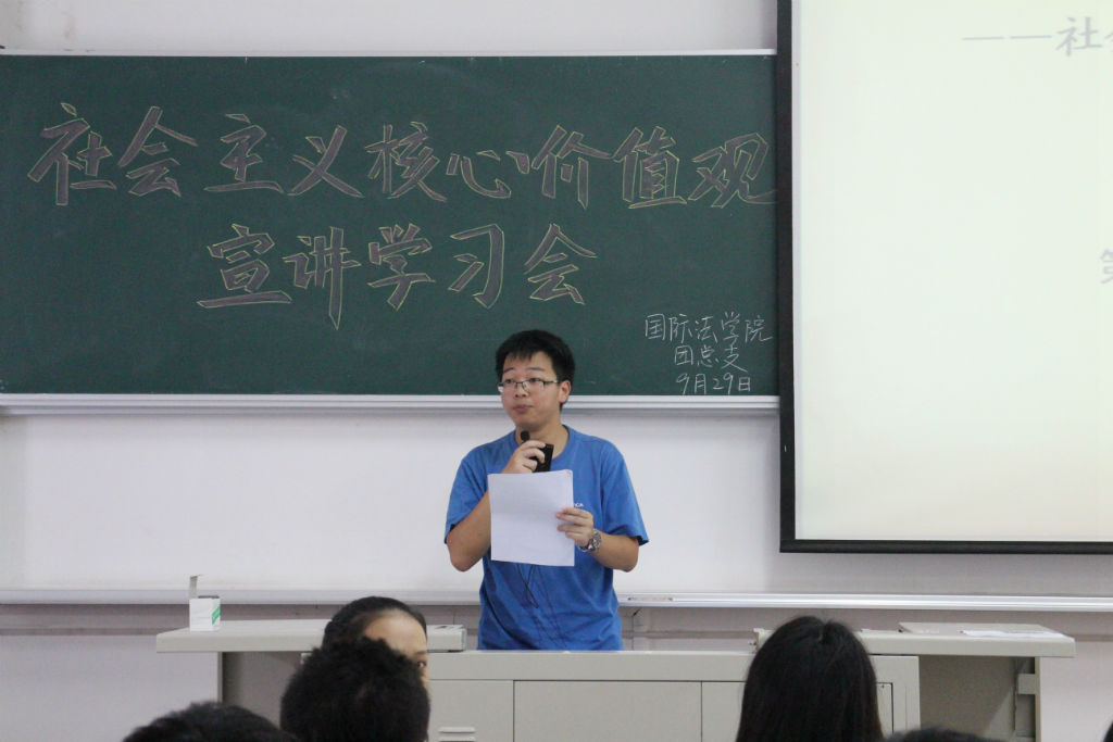 2014年9月29日,由国际法团总支主办的“社会主义核心价值观”宣讲学习会于主教103C顺利开展,团总支书记唐胜楠、团学联主要学生干部、各团支部代表出席了本次学习会。