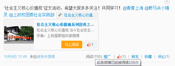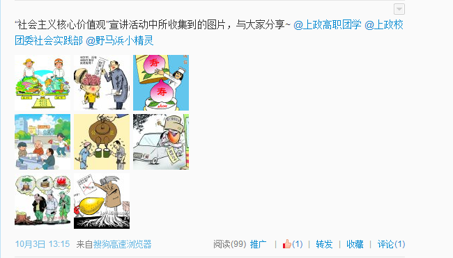 10月1日至10月5日,高职学院团总支利用微博、人人平台大力宣传社会主义核心价值观的有关内容。此前,高职学院团总支面向高职学院13级和14级各团支部征集稿件,各班级同学纷纷通过连环画、感想等各种途径表达自己对于核心价值观的认识,取得了很好的效果。收齐各班稿件后,由高职学院组织部分期发表到组织部的微博和人人主页上,虽然组织部的微博刚刚成立不久,但核心价值观系列版块的成立吸引了大量粉丝,大家都纷纷查阅分享社会主义核心价值观的相关内容,达到了最初寓教于乐的目的。