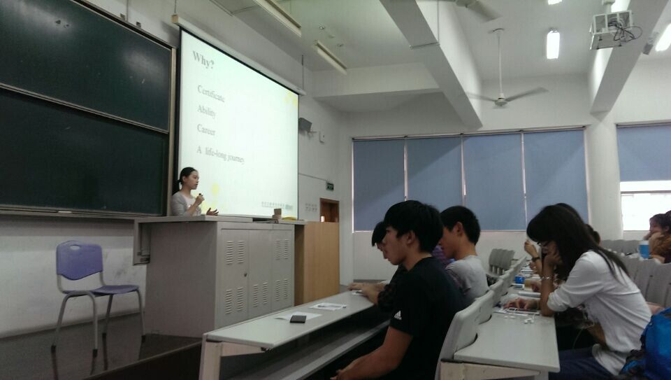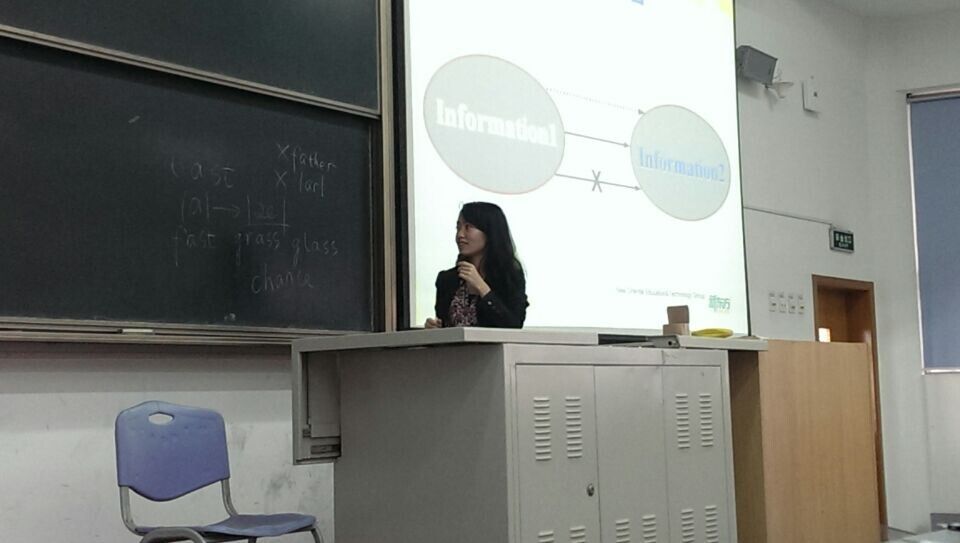 她从精神、语言、文化三方面,以其独特的魅力感染了在场的每一位同学,激发了同学们全身心投入的热情,使同学们受益匪浅。 随后,听力主讲老师施婕以黄金定律要点为主旨,为同学们开展了别开生面的教学课程。她从“音”“语”“题”三大模块为同学们解开了中级口译听力学习的神秘面纱;并以自身的魅力及标准的英语发音,给大家讲授了听力学习的基本方法。她选用典型的例子在轻松的环境中跟大家分享语音对听力的重要作用,并与同学们共同探讨了缩写与连读的基本方式,鼓励同学深入英语文化背景,打破中文式思维模式,激发学习兴趣。施婕老师用其自信的姿态和用心的讲演感染着在场的每一位同学,整个讲座气氛学习气氛浓厚。