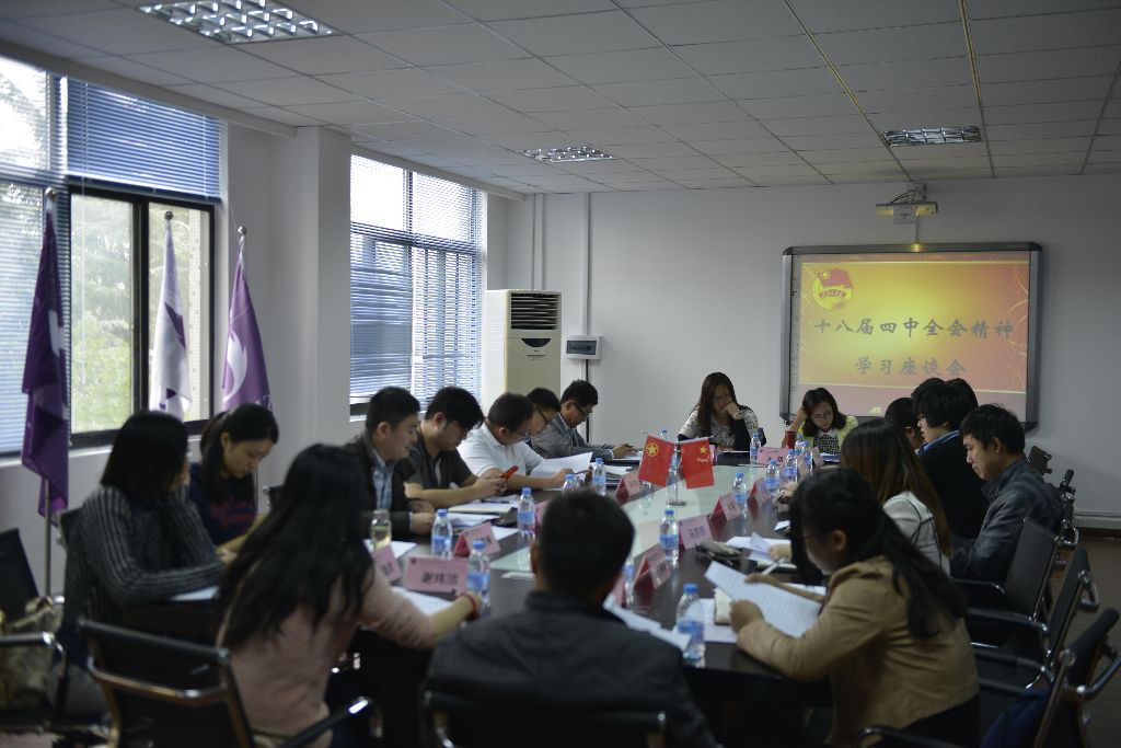 首先,孙留华老师带领团干部进行了十八届四中全会的学习。然后,大家互相交流了学习心得,周印老师提出“依法治校”,将法律建设运用到学校,加强学校制度建设的观点;李语熙老师提出“从专业发展中培养更多法律人才”的观点,其他团干部也向大家交流了各自的学习心得。最后,团委书记陆嵬老师给出了总结,他强调共青团是帮助青年树立对中国和中国共产党的信仰的平台,青年教师团干部要将建立具有中国特色的民主法治的精神传达于学生。