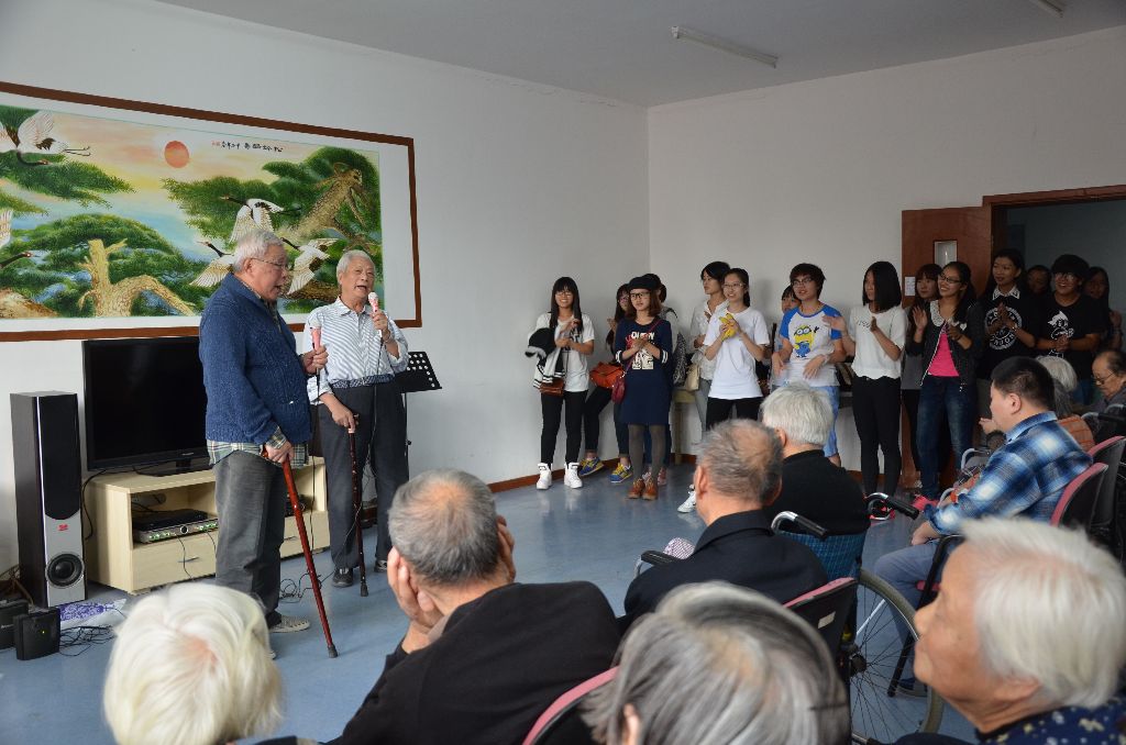 表演结束后,我们分组来到在空气清新的室外,陪老人聊天。老人们谈及年轻时的风光事迹时仍是满腔热血,当某些老人谈及时光岁月、家人儿女时也会存在有淡淡的忧伤之情,但我们也看见了在敬老院里有着深厚情谊的老友,因此可以体会到老人们的要求其实并不高,想要快乐,需要的也许只是在安定生活下有家人或是朋友的陪伴与聊心。快乐的时光总是飞逝,我们依依不舍和老人告别,并相约下次再见。