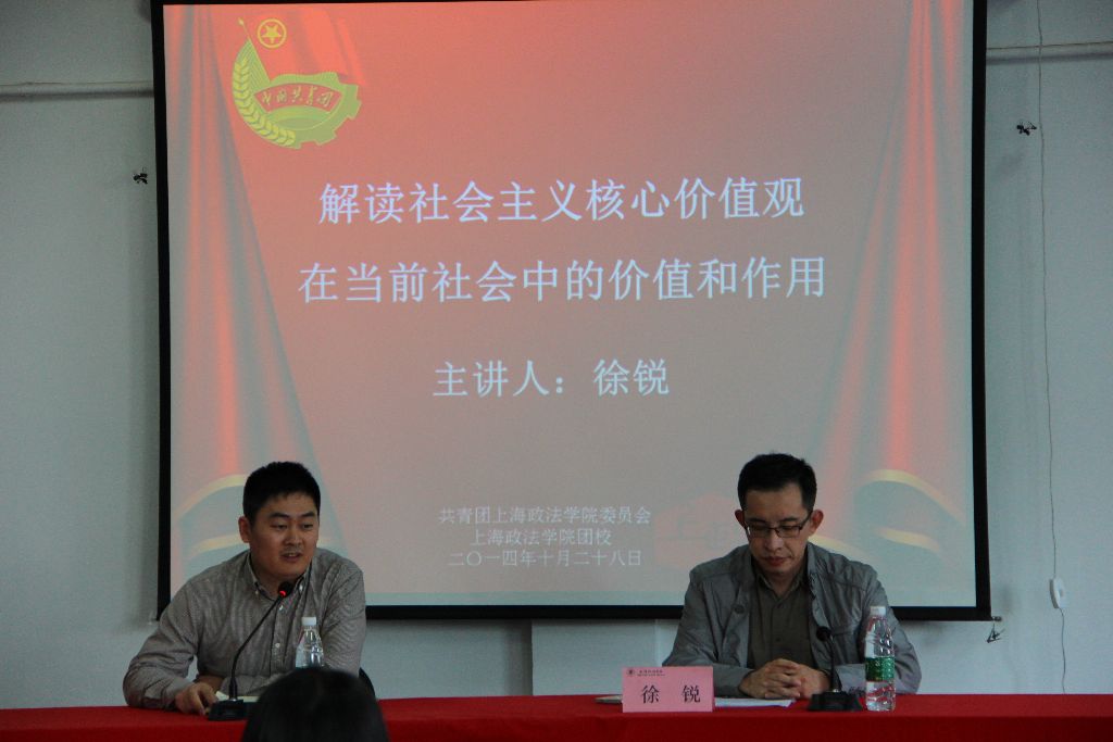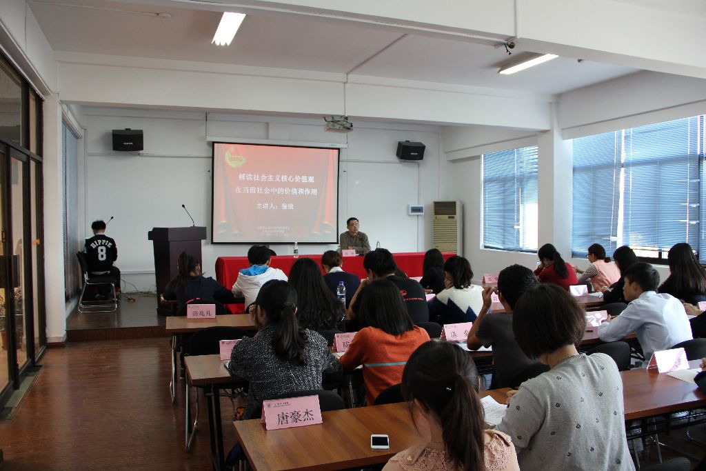 28日下午在学生活动中心206大讲堂,新利18官方客服第五期团校培育和践行社会主义核心价值观培训班举行了以“解读社会主义核心价值观在当前社会中的价值和作用”为题的讲座。校党委宣传部副部长徐锐老师和第五期团校的学员参加了此次活动。