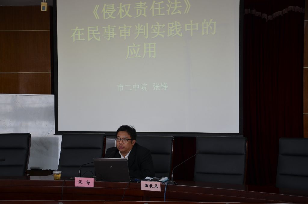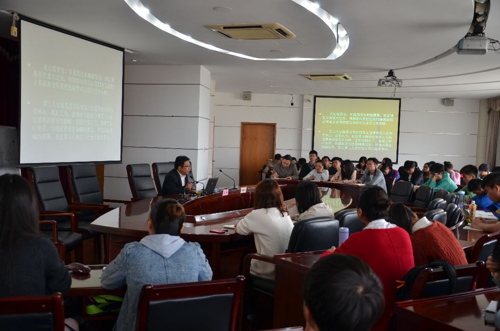 为拓展我校硕士研究生的学术视野,2014年11月6日下午,研究生部在我校求实楼五楼视频会议室主办了以“《侵权责任法》在民事审判实践中的应用”为主题的专题讲座。讲座由我校研究生部潘牧天教授主持,2014级全体硕士研究生参加聆听了本次讲座。