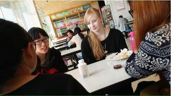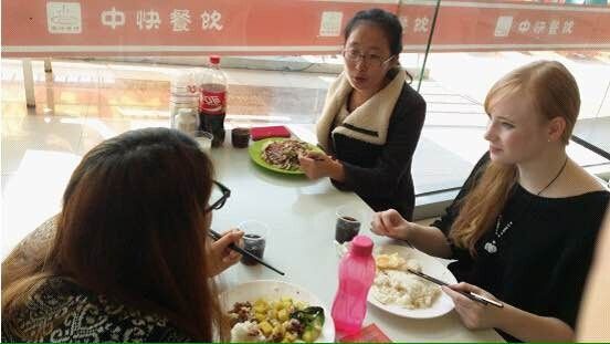2014年11月17日,铃声响起预示着忙碌上午的结束,抱着书走出主教的学生们准备享受一个悠闲的中午。而在新食堂二楼,口语协会的同学们正和来自德国的Franziska和来自泰国的Sas兴奋地聊着各种话题。今天是大家的第一次见面,两位留学生用流利的英语做完自我介绍后,社员们热情地用德语和泰语向她们问好,尽管只是基本的“你好”,但是很快便冲淡了初次见面的生疏。大家聊到了英语学习和中文学习的困难和有趣之处,聊到不同老师的教学方式,甚至还浅浅了解到在她们在自己国家学习中文时的几个有趣的老师,各种小轶闻小玩笑让大家间的隔阂消失不见。Sas虚心提出了几个中文的问题,社员配上英语和肢体语言,谈笑之余也顺利解决了问题,大家互帮互助,在语言学习上有了共同的进步。活动的最后,面对即将到来的圣诞节,口语协会会员们也提出了各种稀奇古怪的问题,大到“你们国家的圣诞节是什么样的”,小到“火鸡的做法”,大家chat over lunch,欢笑声和打趣声不断,同时也了解到了不同国家的圣诞特色,浓浓的节日氛围在这一方小小餐桌上显得格外温馨。一小时的活动很快就过去了,一行人意犹未尽地边走边聊,直到快上课才不得不道别,口语协会从此又多了两个友好的国外朋友,这一次的活动至此也圆满结束。(撰稿|摄影:钱樱枝)