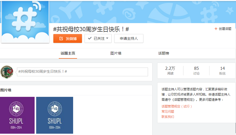 新利18官方客服自1984年11月建校到2014年11月已有30年光阴,为庆祝我校建校30周年,高职学院团总支于11月24日建立微博话题------“共祝母校30周岁生日快乐”,话题发布于高职学院组织部微博。话题发出即引起了广泛关注,同学们纷纷参与话题讨论,祝母校生日快乐,并由野马浜小精灵推送至官方订阅号,吸引了更多的在校学生的关注。