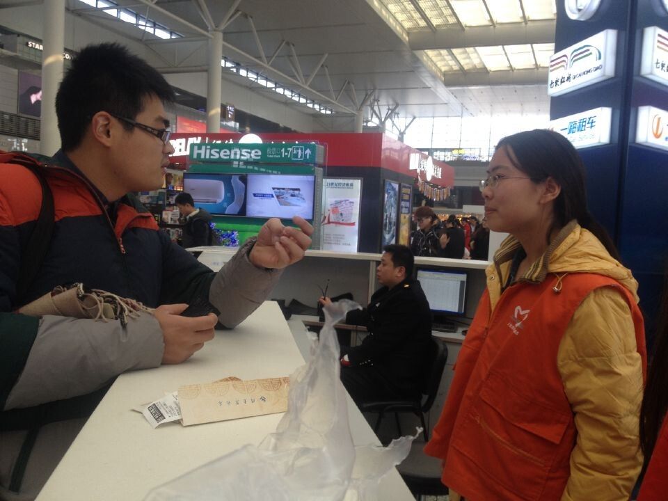 早上8:30分,志愿者们就早早赶来,认真听从领队的安排和部署,随后就坚守在各自的岗位上,直到11:30分才轮流去吃午餐。他们的服务态度和热情得到了旅客朋友们的一致认可和赞扬。在面对外国友人的咨询时,志愿者们大胆秀出了英文,耐心地予以回答。