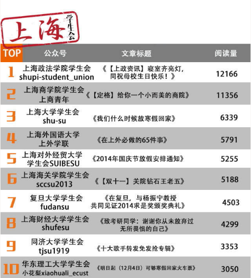 高校微信公众号是一所大学内外传递信息,凝聚情感的重要渠道,在对外宣传与校内沟通上有很大影响力。大数据时代,为了能系统的了解高校日常微信推送的影响范围及其间相互排名,浙江传媒学院相关团队就江浙沪各高校的学生会、学工、团委三方面在2014下半年的微信阅读量进行了统计,我校学生会所发布“【上政资讯】寝室齐亮灯,同祝母校生日快乐”获上海市各高校学生会微信号的最高阅读量。