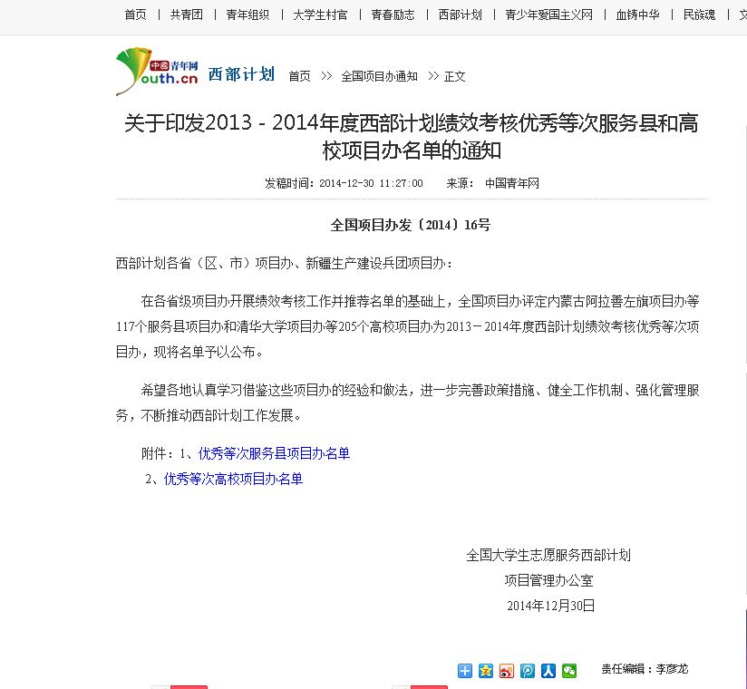 1月14日,从团中央传来讯息,在各省级项目办开展绩效考核工作并推荐名单的基础上,我校项目办(校团委)被评为全国2013-2014年度西部志愿者绩效考核优秀等次项目办,与我校项目办一起获得此项荣誉的复旦等上海9个高校项目办。