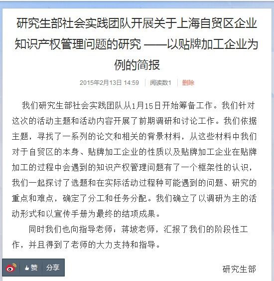 我们实践小队于2月中旬继续对贴牌加工企业进行实地问卷走访。我们走访了松江的一些贴牌加工企业,并受到了这些企业的支持和配合。我们调查了松江商业发展有限公司,这里有一系列的公司和企业,我们对这些企业意义走访调查,对于这些企业的贴牌加工和知识产权状况进行问卷式的调查,并和企业的知识产权管理人员进行了交谈了解了企业的知识产权管理现状和在贴牌加工中遇到的商标等问题。