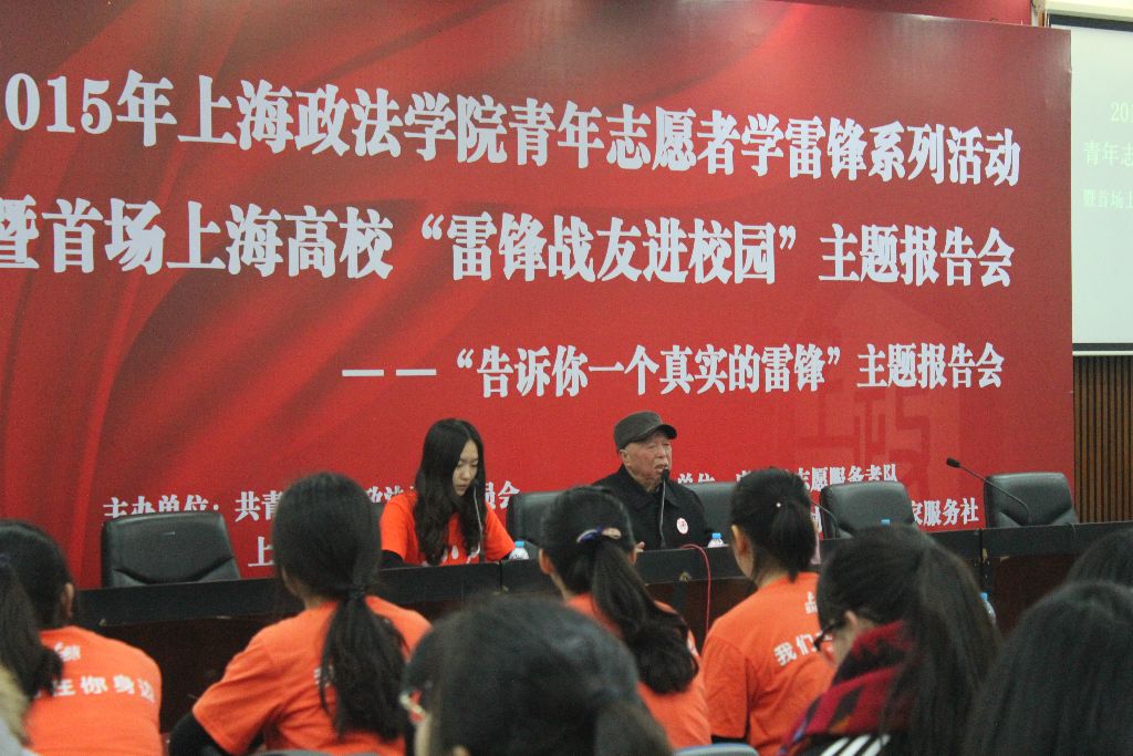 下午14点30分,“雷锋战友进校园”主题报告会在庸夫楼101举行,雷锋同志生前连长也是雷锋事迹的主要见证者虞仁昌同志来到我校向百余名上政青年学子做了“告诉你一个真实雷锋”的报告。活动开始前,校党委副书记、纪委书记霍光同志在校部楼亲切会见了报告团一行并就学雷锋活动进行了深入交流。报告会中虞仁昌连长深情回顾了雷锋的成长工作经历,用几个事例让我们领略了雷锋除了乐于助人之外,热爱毛主席、热爱共产党、知恩必报、读书明理的一面。最后虞仁昌连长希望上政学子传承雷锋精神,把学雷锋精神和志愿者服务相结合,让雷锋精神继续在大学生志愿者中传播。