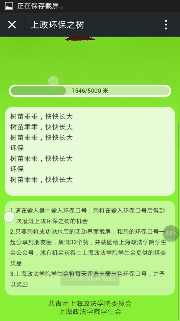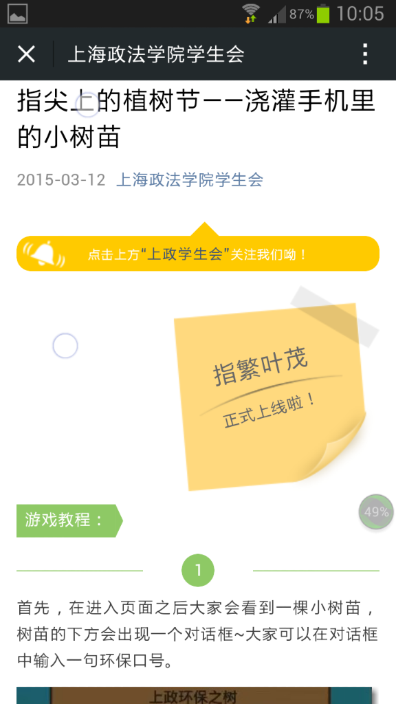 在3月12日植树节来临之际,为增强青年团员的环保意识。在校团委指导下,校学生会利用微信平台自主开发并推出上海高校首款微信线上植树活动“指尖上的植树节—浇灌手机里的小树苗”。