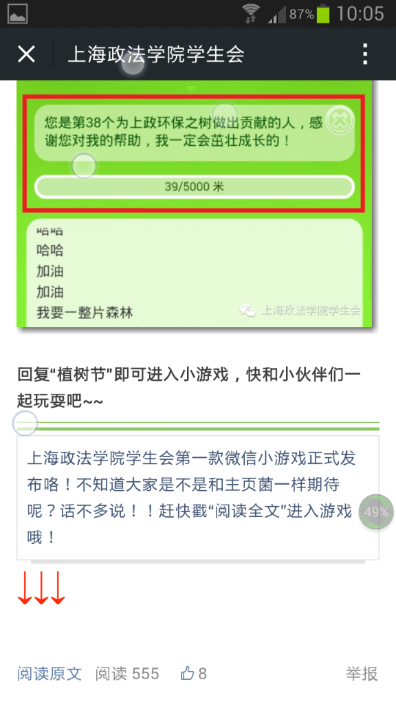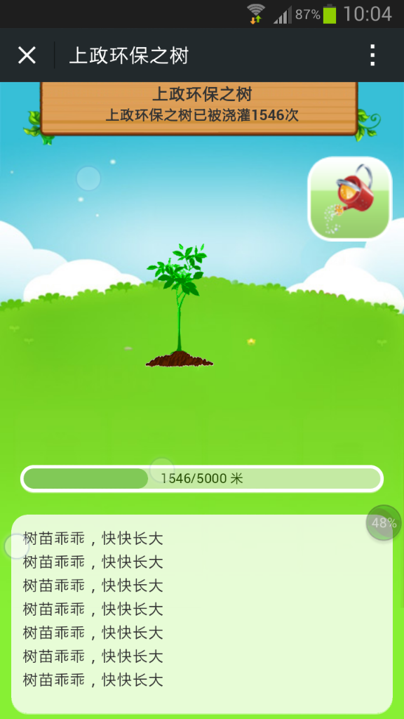 根据游戏设定,每位参与者可以同学校学生会微信平台上的链接进入游戏界面,然后发送一句环保口号,就能为小树苗浇一次水,小树苗也会因此生长1m。只要参与人数达到一定数量,小树苗就会长成一棵参天大树。活动一经推出就获得了大量的点阅量,参与人数也节节攀升。活动界面上的环保口号滚动播放,树苗逐渐长大,更多人意识到了“植树节”这个节日,更多人关注到了绿色。