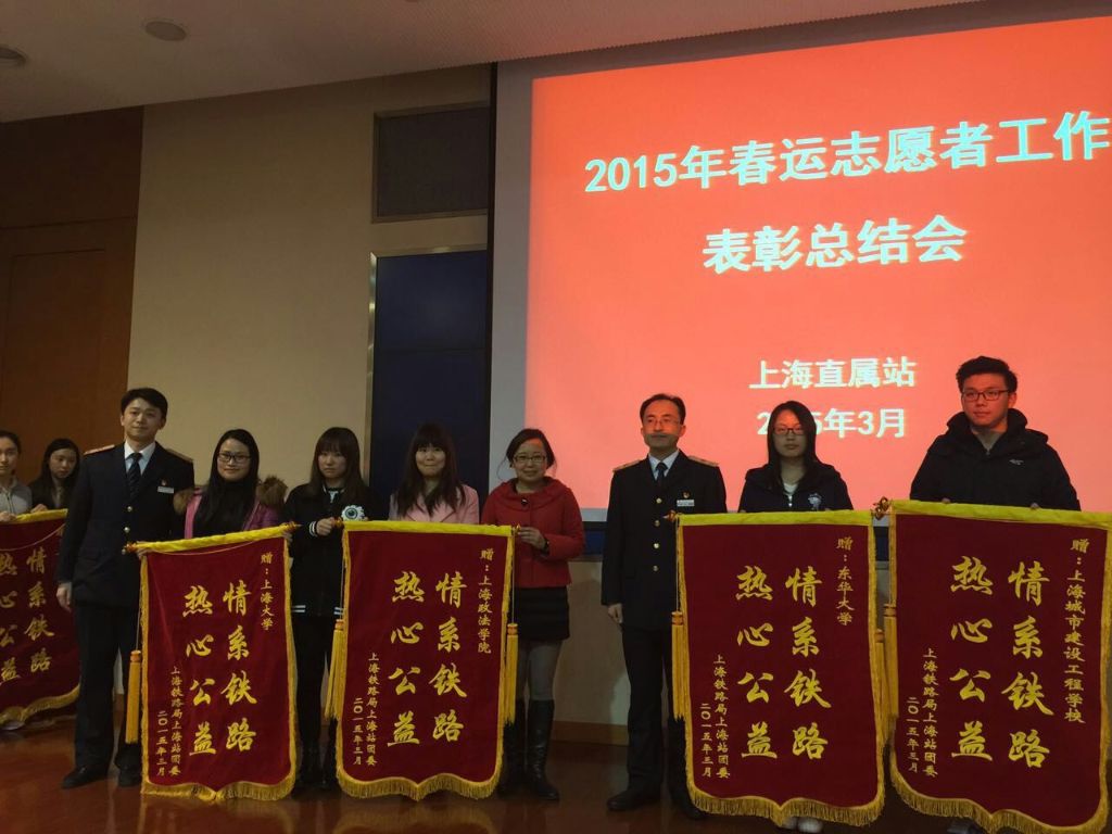 会上,上海铁路局上海站团委书记陈浩对2015年铁路上海站春运志愿者工作进行总结。他肯定和赞扬参与春运志愿活动的各大高校志愿者,对积极组织学生参与的学校表示感谢。在激昂的音乐声中,上海铁路局上海站团委为我校等9所参与高校赠送锦旗。