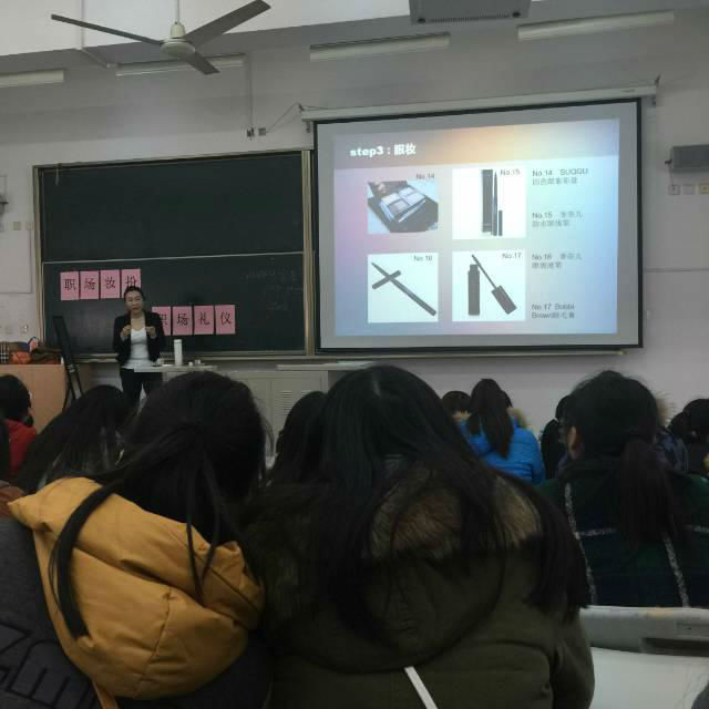 开场时,法丽娜老师为了更好的教学效果素颜出席,向大家展示了职场妆容中需要的各种化妆品,并从底妆至彩妆详细的分步讲解,每一步骤中都有向同学们推荐合适的产品以及正确的使用方法。期间法丽娜老师亲身上阵,以自己为模板向大家展示彩妆在正确使用方法下呈现的效果,获得了在场同学的一致好评。妆容部分结束后,法丽娜老师开始讲解职场中女性的衣着服饰搭配,为不同场合及不同身材提供了合适的服饰搭配方法。接下来法丽娜老师又讲解了围巾及其他配饰对于女性装扮的重要性,说明了好的配饰往往能起到画龙点睛的作用。讲座期间法丽娜老师与台下同学互动热烈,尤其是在各个环节“以身试法”,配合精美的ppt,使讲座十分生动形象。