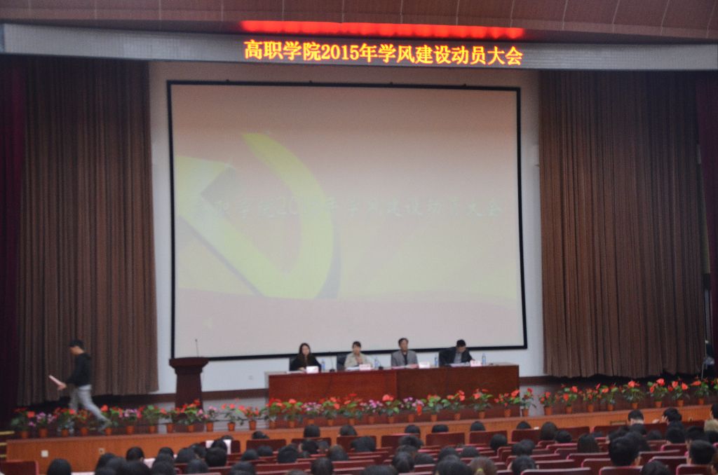 为进一步加强学风建设,做好人才培养,全面调动学生学习积极性,营造良好的学院氛围,4月15日晚6点30分,高职学院在天马讲堂召开2015年学风建设动员大会,大会由高职学院团学承办。出席此次学风建设大会的有高职学院党总支书记马小娜,高职学院团总支书记团马莎莎,高职学院班主任朱德清、郭平。高职学院13届、14届全体学生参加会议。会议由高职学院党总支书记马小娜主持。